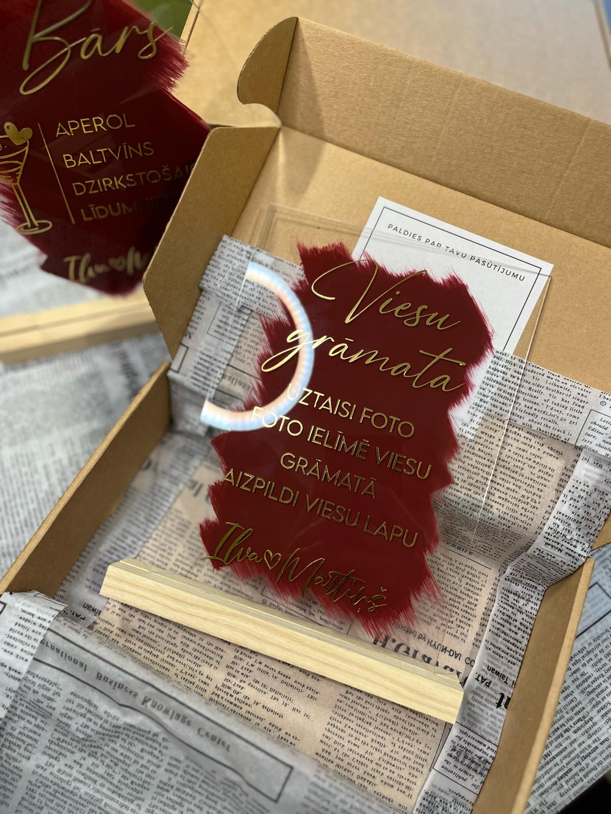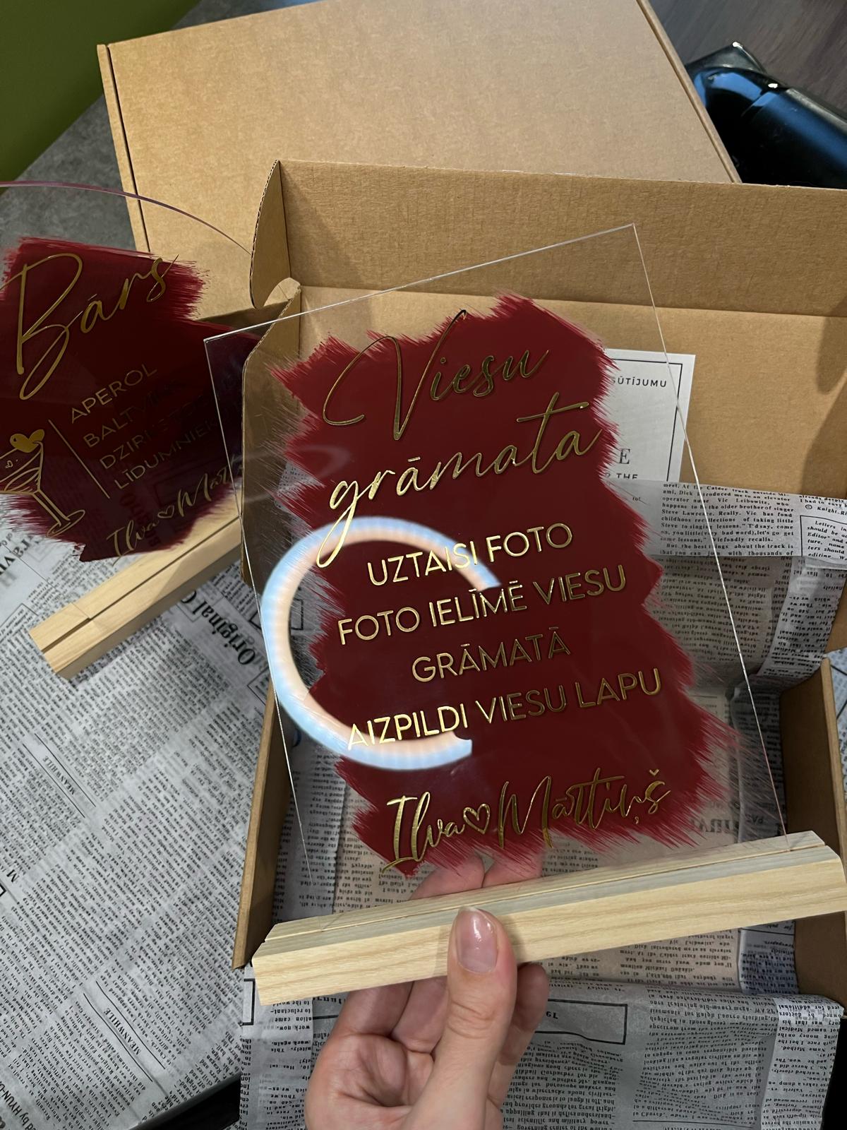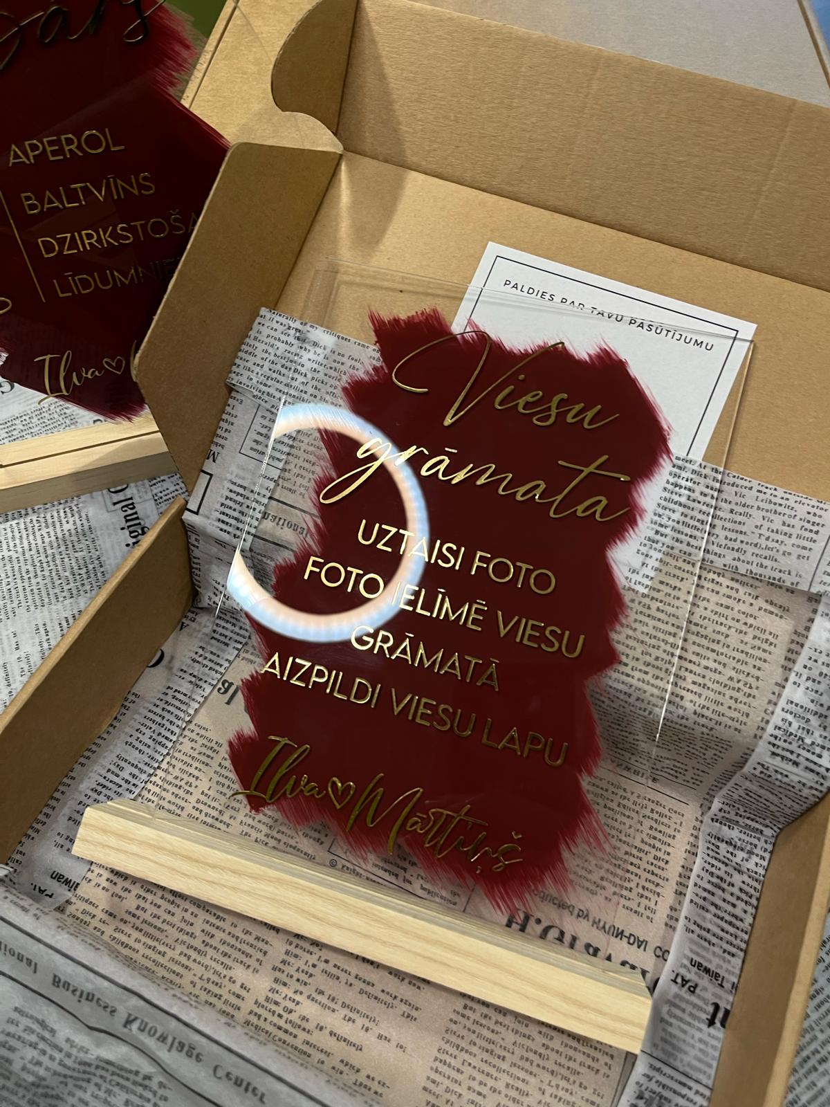 Piedāvājam mūsdienīgu un eleganti viesu grāmatas norādi L izmērā. Katrs mūsu produkts ir izgatavots no augstas kvalitātes akrila un stāvēs stabilā koka statīvā. Taisnstūra forma ir 13 x 17 cm