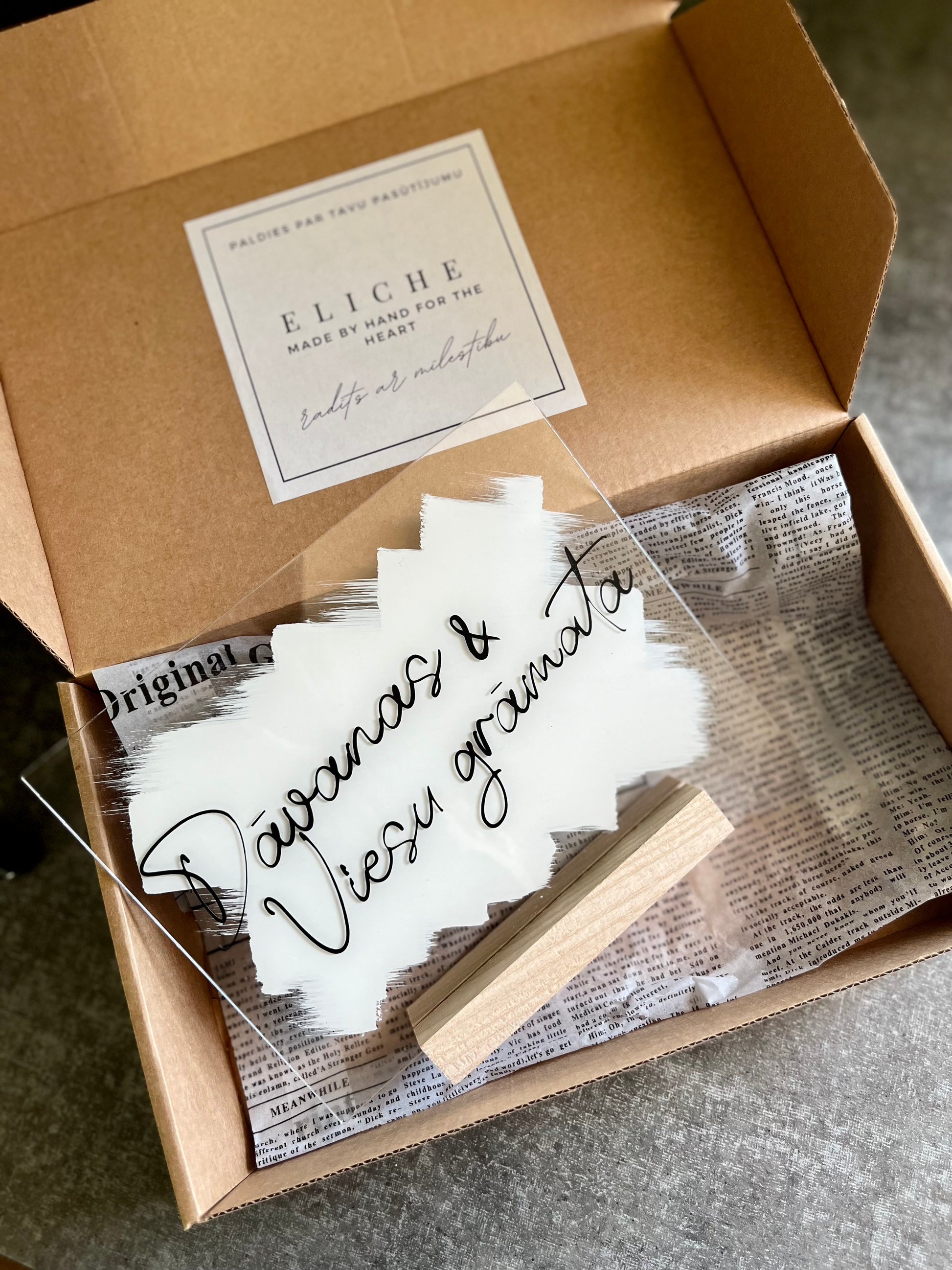 Katrs ELICHE produkts ir izgatavots no augstas kvalitātes akrila un stāvēs stabilā koka statīvā. Taisnstūra forma ir 13 x 17 cm.