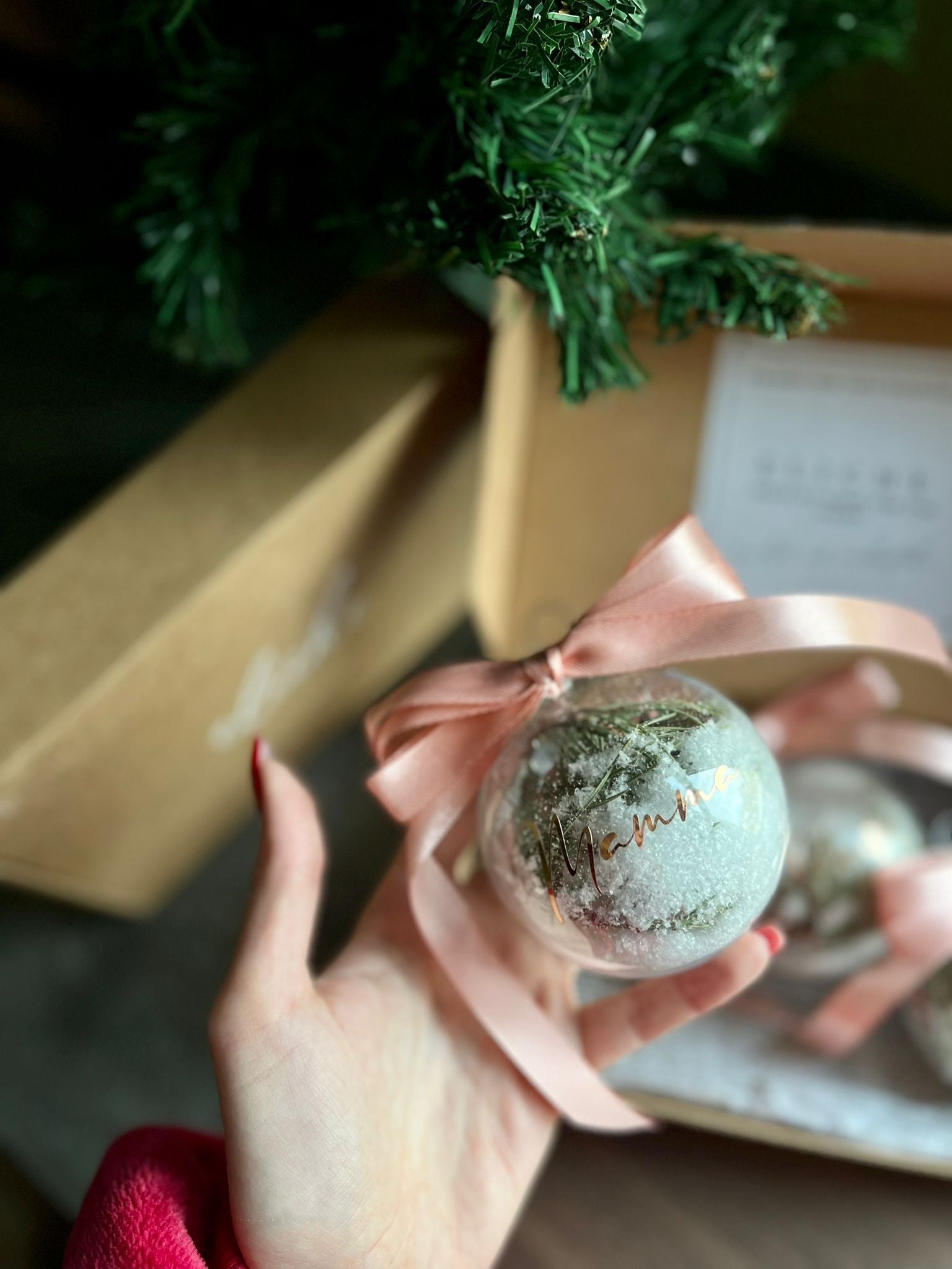 Personalizēta eglītes bumba ar zelta vārdu, priedes zaru, mākslīgo sniegu ar rozā bantīti.