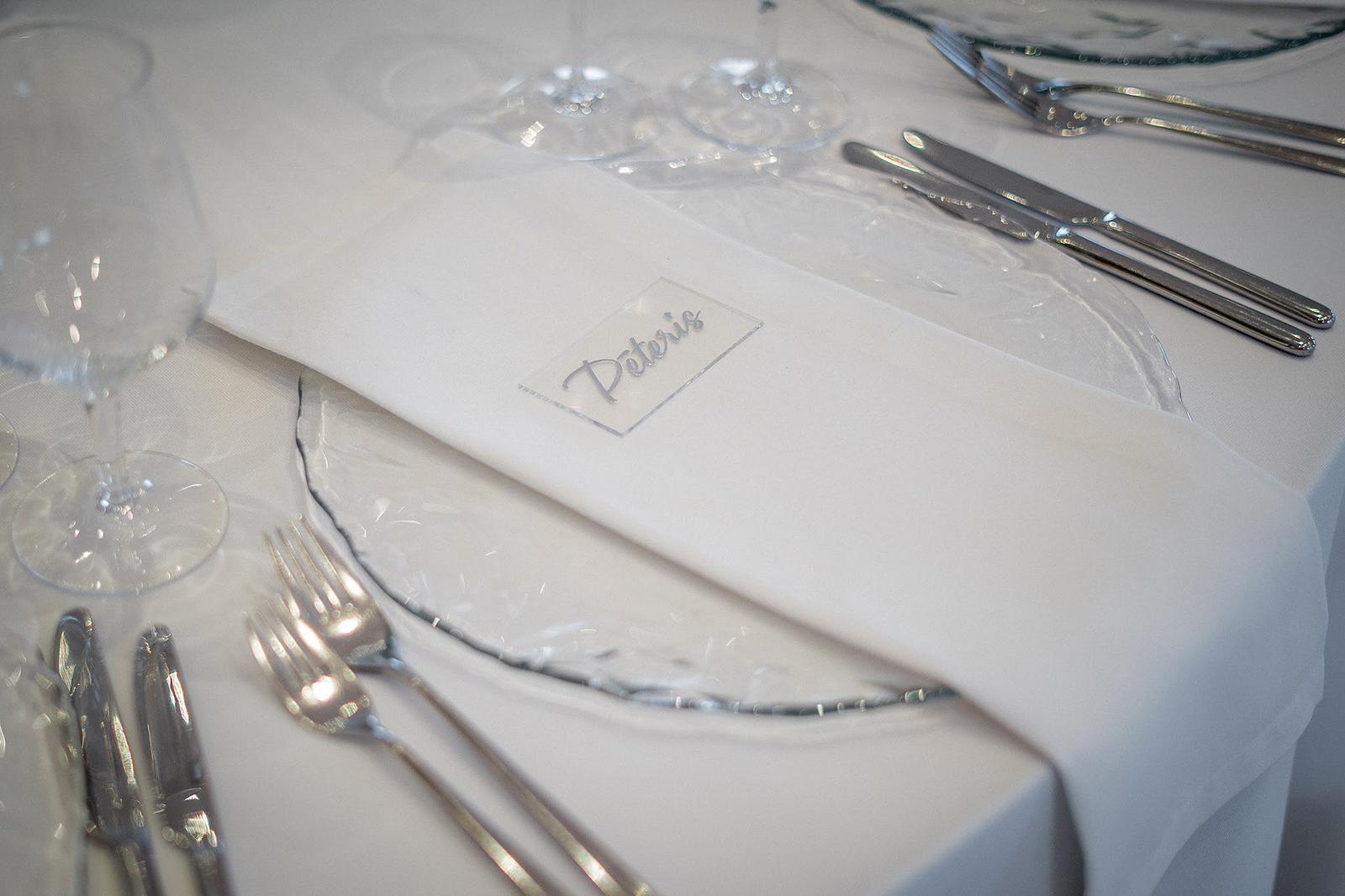 Personalizētas akrila galda kartes. Katrā kartītei ir uzlīmēts viens līmplēves vārds un pēc izvēles uzvārda iniciālis, piemērots jebkuriem svinīgiem notikumiem – kāzām, dzimšanas dienām vai korporatīvajiem pasākumiem.